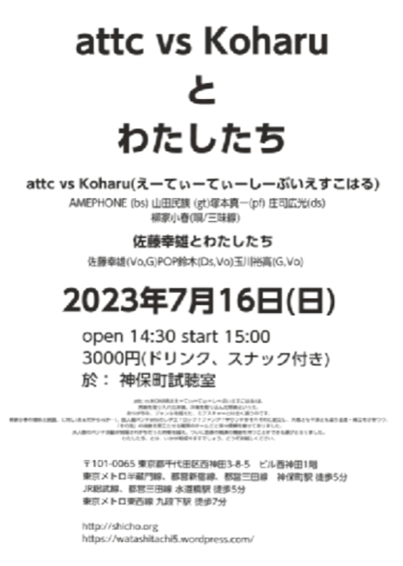 出演:attvc vs Koharu【AMEPHONE (b), 山田民族 (g), 塚本真一 (pf), 庄司広光 (ds), 柳家小春 (唄/三味線)】/ 佐藤幸雄とわたしたち【佐藤幸雄 (Vo,G), POP鈴木(Ds,Vo), 玉川裕高 (G,Vo)】