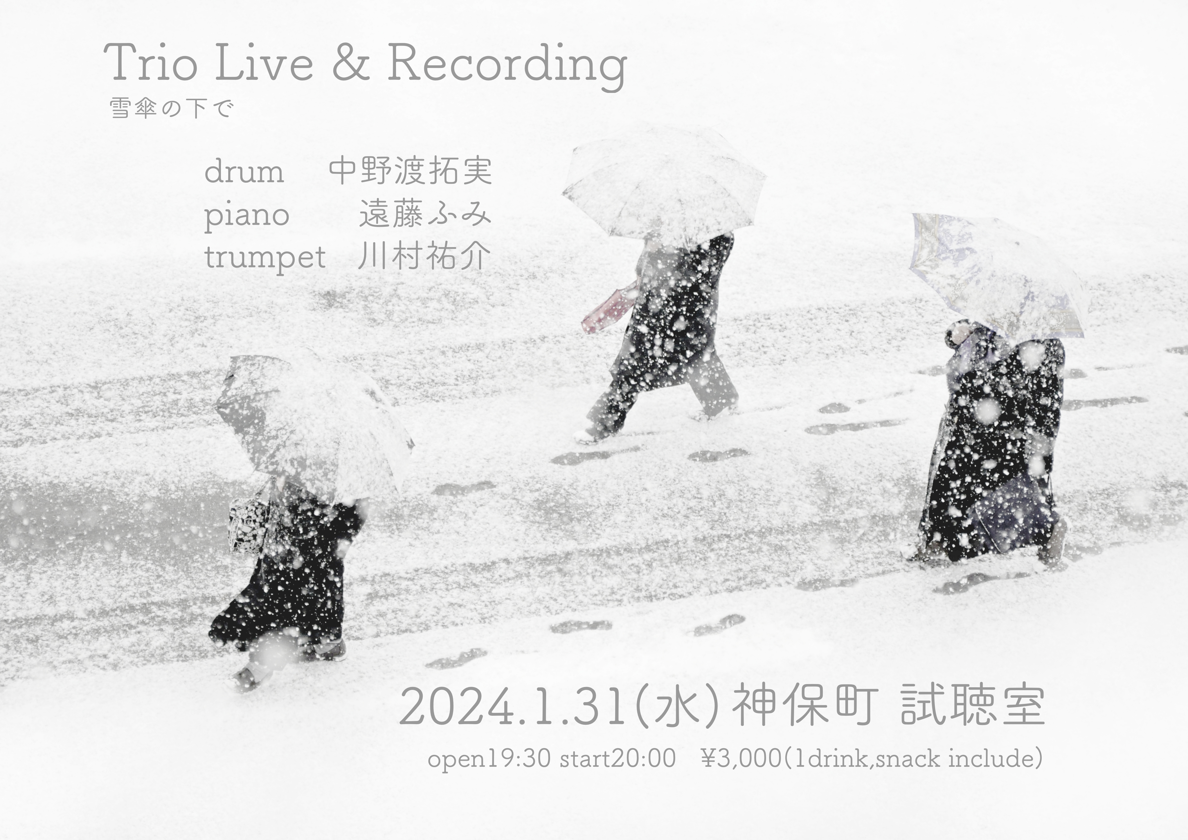 Warning: Use of undefined constant moretag_custom - assumed 'moretag_custom' (this will throw an Error in a future version of PHP) in /home/mtrw22/mwx.jp/public_html/shicho.mwx.jp/wp/wp-content/themes/shichoshitsu2013/functions.php on line 341 試聴室 » Trio Live&Recording『雪傘の下で』【遠藤ふみ(piano), 川村祐介(trumpet), 中野渡拓実(drum)】