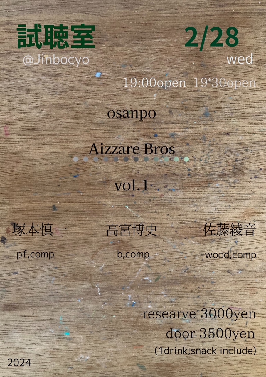 Warning: Use of undefined constant moretag_custom - assumed 'moretag_custom' (this will throw an Error in a future version of PHP) in /home/mtrw22/mwx.jp/public_html/shicho.mwx.jp/wp/wp-content/themes/shichoshitsu2013/functions.php on line 341 試聴室 » osanpo Aizzare Bros vol.1【塚本真一/pf,comp、高宮博史/b,comp、佐藤綾音/wood,comp】